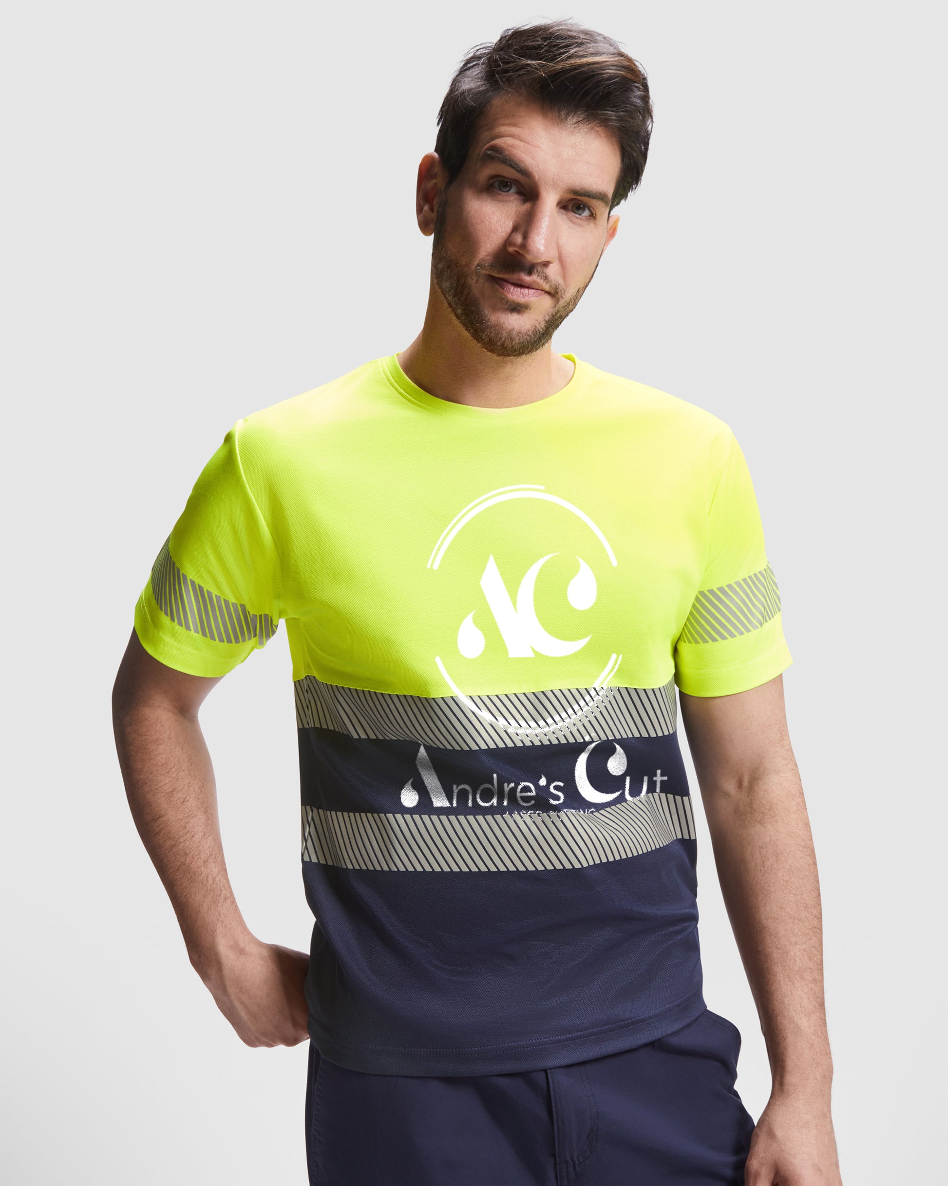 T-shirt técnica de manga curta de alta visibilidade. · Duas tiras segmentadas de alta visibilidade no peito e uma nas mangas. · Pescoço redondo no tecido principal. · Tecido misto confortável em poliéster e algodão para maior respirabilidade.